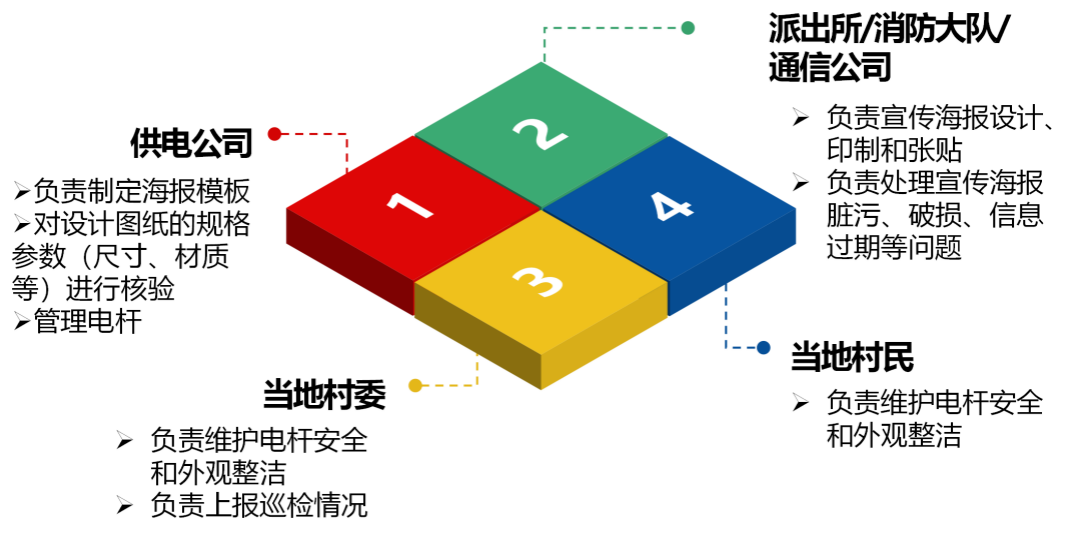 供電公司對內(nèi)發(fā)出調(diào)查問卷82份,結(jié)合80%以上人員意見,確定離地面2米左右電桿桿體為主體資源,與消防大隊(duì)、通信公司、派出所、屬地村委共同搭建以電桿為載體的合作平臺。通過理想邊界分析,劃定各方實(shí)施過程中的責(zé)任邊界,明確制作方、張貼方、管理方等相關(guān)方在實(shí)施過程中的責(zé)任,實(shí)現(xiàn)資源共享,各方合作共贏。