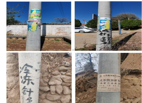 2023年,國網(wǎng)沁縣供電公司(以下簡稱“沁縣公司”)探索出利用廢舊電桿為鳥筑巢的方法,壓降在運(yùn)線路跳閘率30%。這一實(shí)踐為自有電力設(shè)備資源的高效利用探索出新路徑?;诖?,2024年沁縣公司進(jìn)一步探索農(nóng)村在運(yùn)電桿潛在價(jià)值釋放。經(jīng)調(diào)研,沁縣全域533個(gè)自然村,平均每個(gè)自然村有40基電桿,大約21320基電桿。60%電桿的桿體存在被亂涂亂畫、張貼小廣告等影響鄉(xiāng)村美觀的問題(如圖1),與鄉(xiāng)村振興的時(shí)代課題不相適應(yīng);5%緊貼路邊的電桿容易受外力撞擊,造成桿體破損,形成安全隱患;95%以上電桿桿體缺乏管理,電桿下端位置未被有效利用。