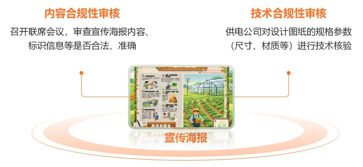 3.防風(fēng)險(xiǎn):逐級合規(guī)審查。建立宣傳海報(bào)“雙重審核”機(jī)制(如圖7)。召開聯(lián)席會(huì)議進(jìn)行內(nèi)容合規(guī)性審核,確保符合政策及公眾需求;供電公司進(jìn)行技術(shù)合規(guī)性審核,保障安全性與電力設(shè)施兼容性。