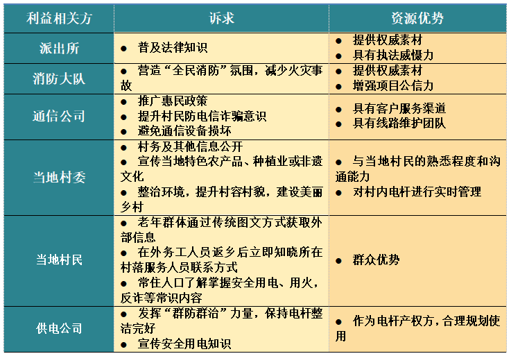1.深挖多元訴求。向沁縣區(qū)域11個(gè)鄉(xiāng)鎮(zhèn)具有代表性的11個(gè)村發(fā)放110份“電桿新語”調(diào)查問卷,收回103份。通過收回的103份調(diào)研記錄形成初步調(diào)研方案,再通過調(diào)研方案分別同當(dāng)?shù)卮逦?、派出所?5個(gè)部門單位座談交流,全面獲取各方訴求與資源(如表1)。
