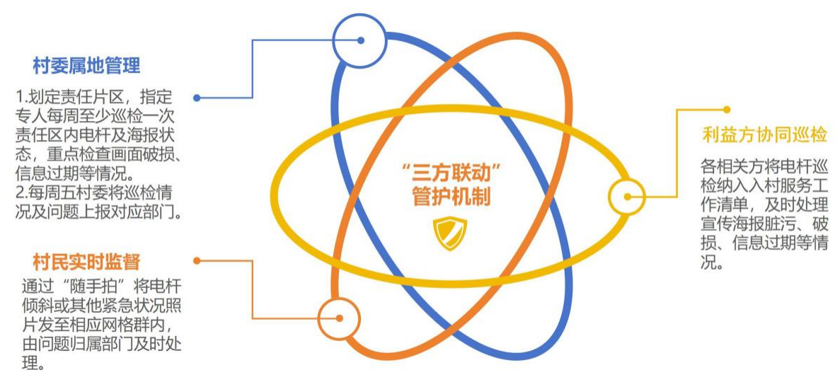 3.利益方協(xié)同巡檢。利益相關(guān)方將電桿巡檢納入入村服務(wù)工作清單,及時(shí)處理宣傳海報(bào)臟污、破損、信息過期等情況。